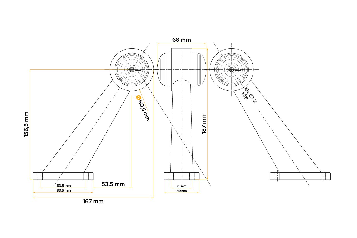 Le feu de gabarit W21.3Ż (263/l) de WAŚ est destiné à être monté sur le côté gauche et droit du véhicule et a les dimensions suivantes : largeur 167 mm, hauteur 187 mm, profondeur 68 mm. Equipé d'un bras de fixation en caoutchouc et d'un câble rond de 0,25 m, il permet une installation facile et rapide.