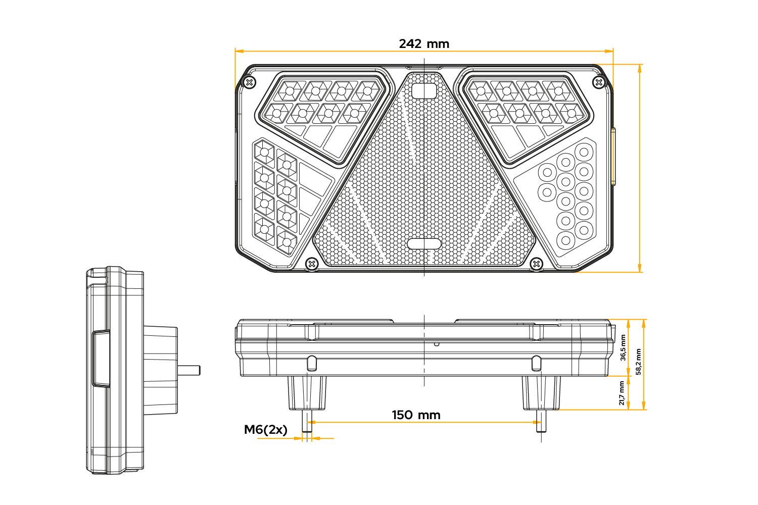 Le feu arrière W125L de WAŚ est conçu pour être monté sur le côté gauche du véhicule et a les dimensions suivantes : largeur 242 mm, hauteur 134 mm, profondeur 58 mm. Equipé d'un passe-fil à l'arrière de la lampe qui facilite la connexion du câble, ce qui en fait une solution idéale pour une utilisation dans les remorques, les bus et les dépanneuses.
