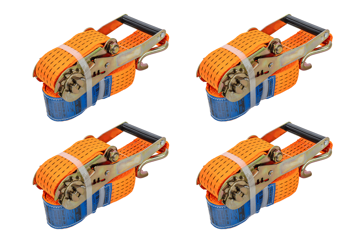 Un jeu de quatre sangles à cliquet UNITRAILER orange, chacune composée de deux parties : une partie courte avec cliquet et crochet, et une partie longue avec sangle et crochet. La longueur totale de chaque sangle, sangle et boucle comprises, est de 4 mètres, ce qui est suffisant pour arrimer des charges plus importantes. La largeur de la sangle de 50 mm assure une pression suffisante. Chaque sangle offre une force de tension robuste pouvant atteindre 5 tonnes (5000 daN), ce qui en fait l'ensemble idéal pour arrimer des charges plus lourdes nécessitant plusieurs points d'arrimage.