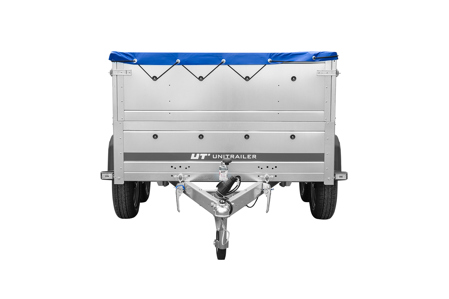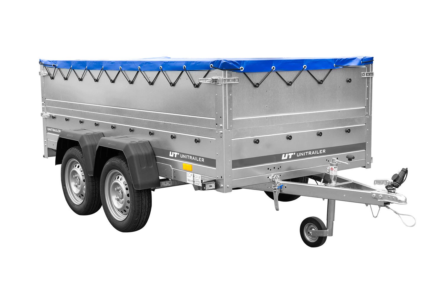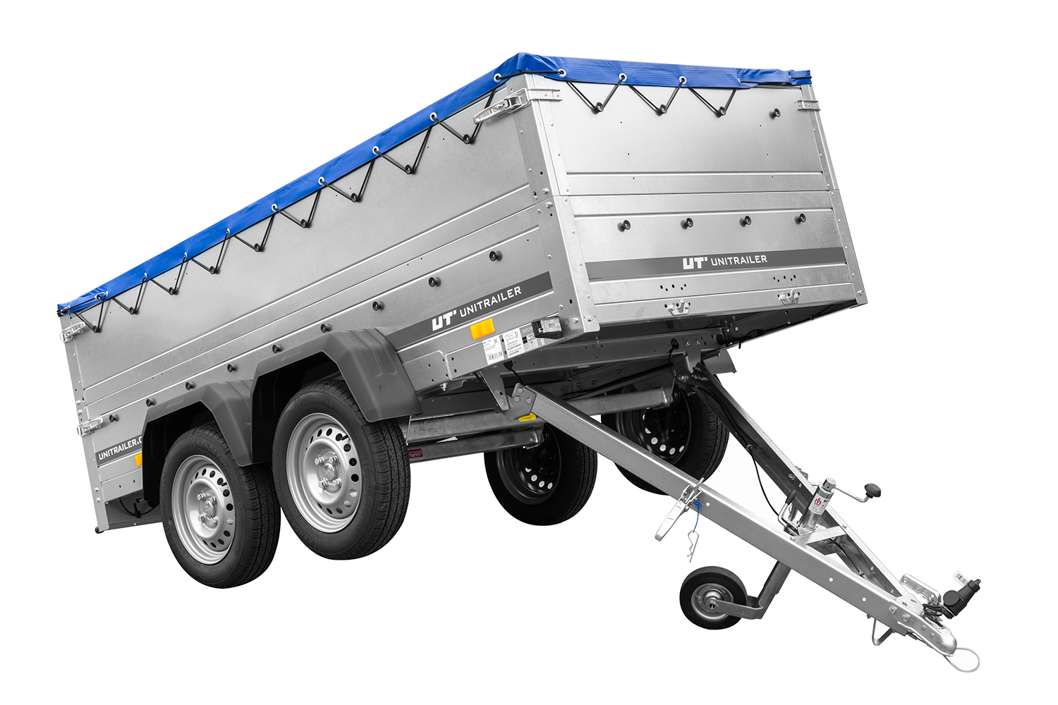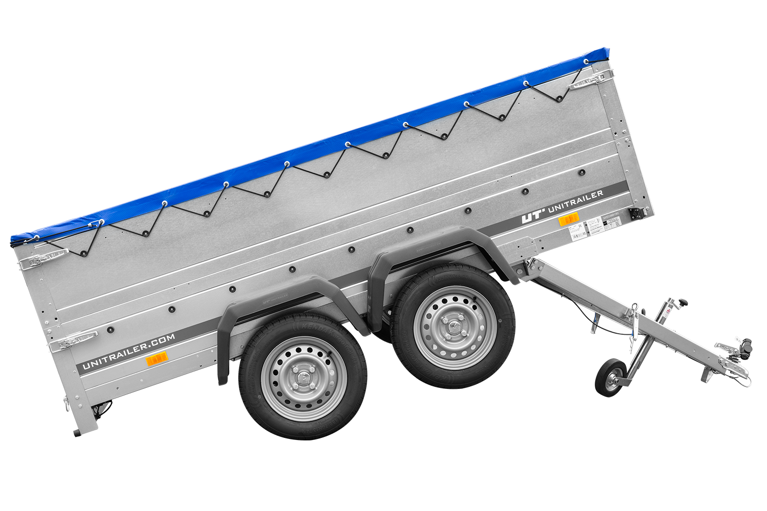 - Remorque de voiture à deux essieux Unitrailer Garden Trailer 264/2 KIPP, dimensions 264x125 cm, sur 2 essieux. Avec roue jockey, tiges de support, ridelles acier supplémentaires 40 cm, bâche bleue.