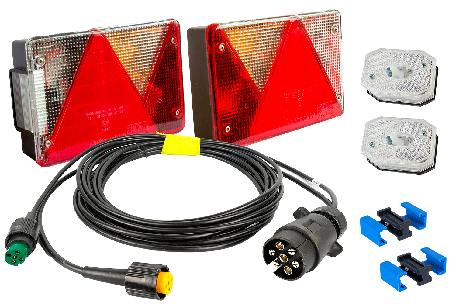 • Kit d'éclairage pour remorques et plateaux améliorant la visibilité et la sécurité routière. Il comprend des feux arrière ASPÖCK MULTIPOINT IV, des feux de gabarit ASPÖCK FLEXIPOINT I, un faisceau de câbles MANTES de 4,5 m avec prise 7 broches et des conn
