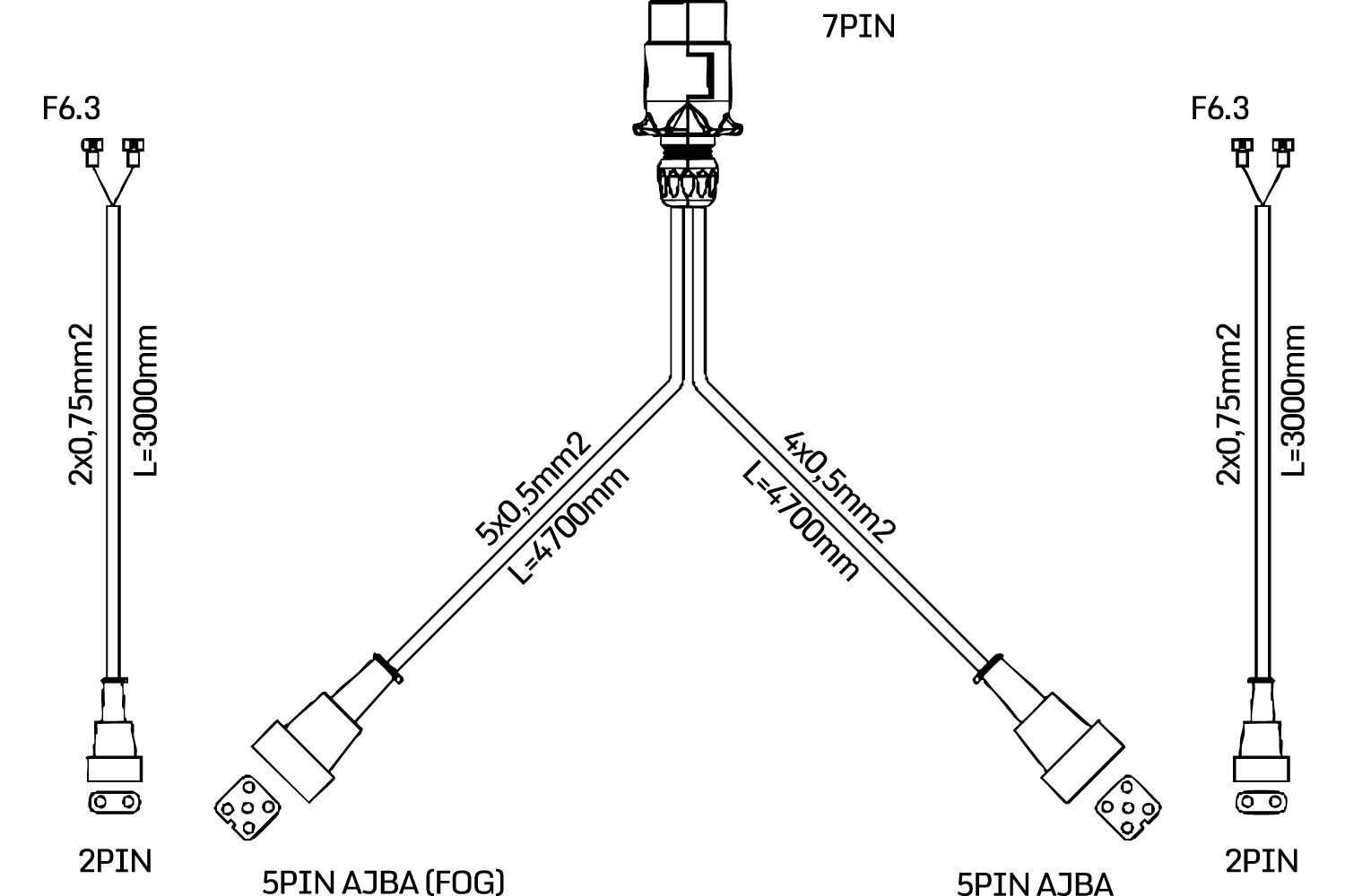Le faisceau est équipé de deux connecteurs à baïonnette AJ.BA broches et de deux connecteurs à baïonnette AJ.BA 2 broches pour le raccordement des feux arrière. Le système à baïonnette assure une installation rapide et sécurisée, éliminant ainsi le risque de déconnexion accidentelle pendant la conduite. La conception des connecteurs garantit une connexion étanche et protège les contacts contre la corrosion, ce qui se traduit par un fonctionnement à long terme et sans panne de l'ensemble de l'installation d'éclairage de la remorque.