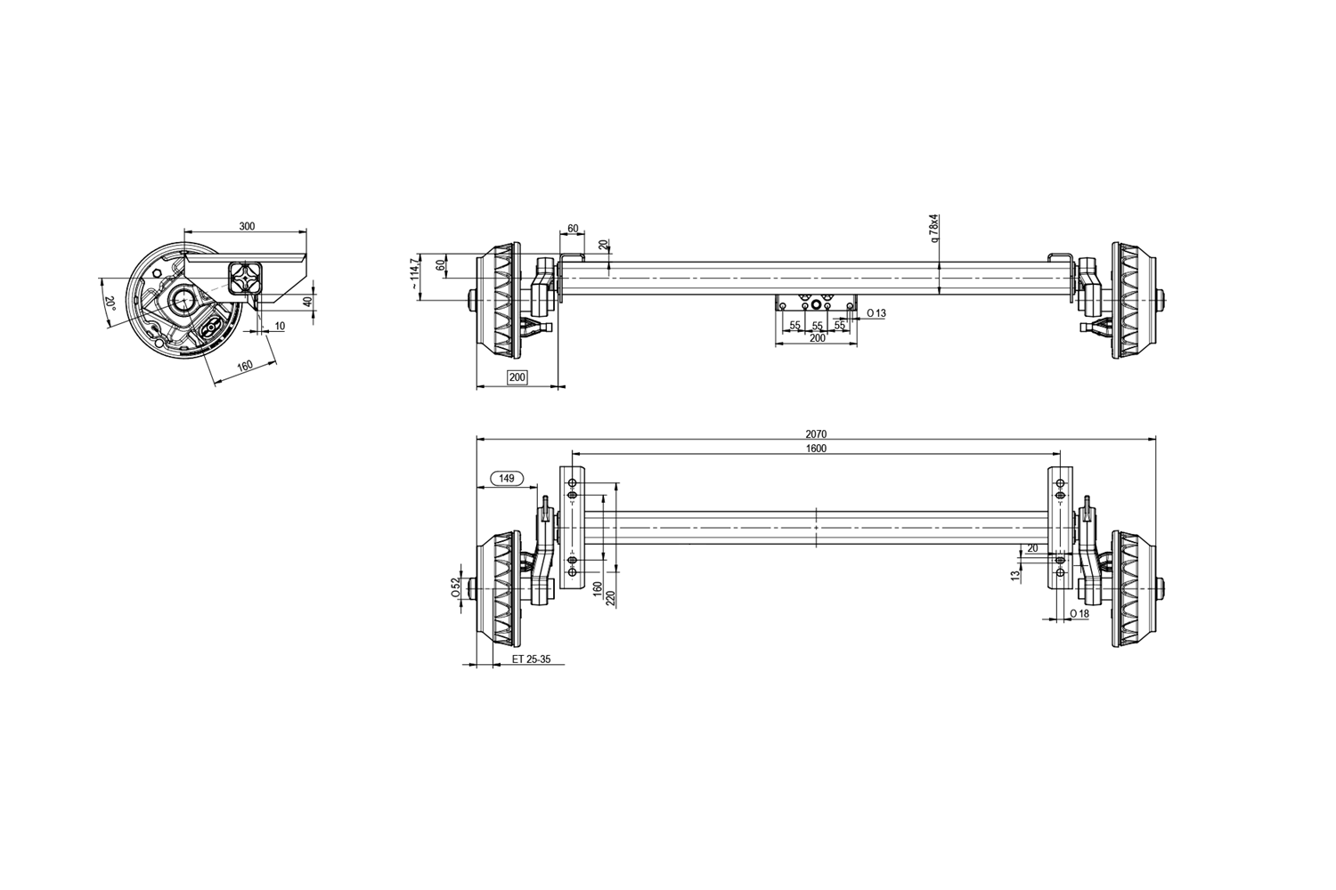 L'essieu freiné KNOTT est destiné aux remorques lourdes ou aux dépanneuses d'une capacité de charge maximale de 1800 kg pour un essieu simple et de 3500 kg pour un essieu tandem. L'espacement des orifices de montage est de 1600 mm, l'espacement des moyeux est de 2070 mm, ce qui permet une installation facile dans une large gamme de véhicules. L'entraxe de boulons de roue 5x112 assure la compatibilité avec la plupart des roues disponibles sur le marché. La longueur du levier du bras oscillant est de 160 mm, ce qui assure une stabilité et une absorption optimale des chocs, augmentant ainsi la sécurité de conduite, même à pleine charge.
