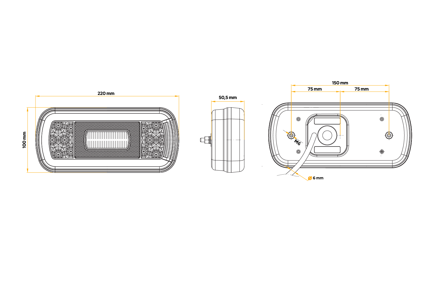 Le feu arrière FT-130 LED d'ASPOCK, destiné à être installé aussi bien sur le côté gauche que droit du véhicule, a les dimensions suivantes : largeur 220 mm, hauteur 100 mm, profondeur 50,5 mm. Adapté pour fonctionner dans la plage de tension de 12 à 36 V, il est utilisé dans les remorques, les camions et les dépanneuses, ce qui souligne son universalité. Equipé d' un câble de 1 m de long, il permet une installation facile et rapide. Grâce à l'utilisation de la technologie LED, la lampe garantit une efficacité, une durabilité et une efficacité énergétique élevées, garantissant la sécurité dans diverses conditions routières.