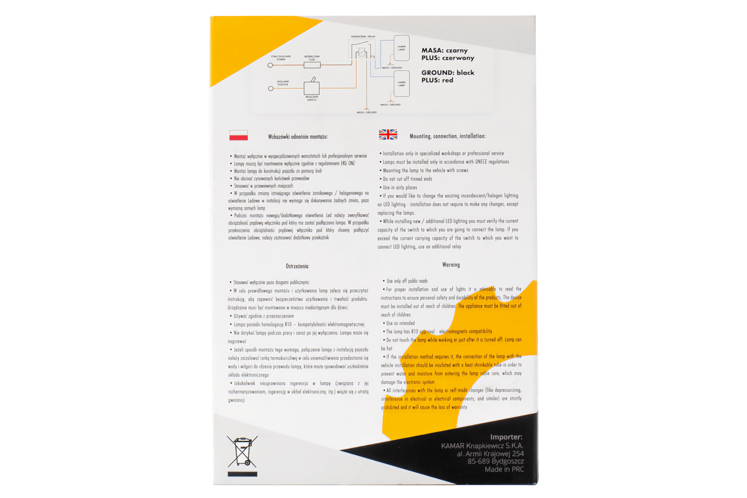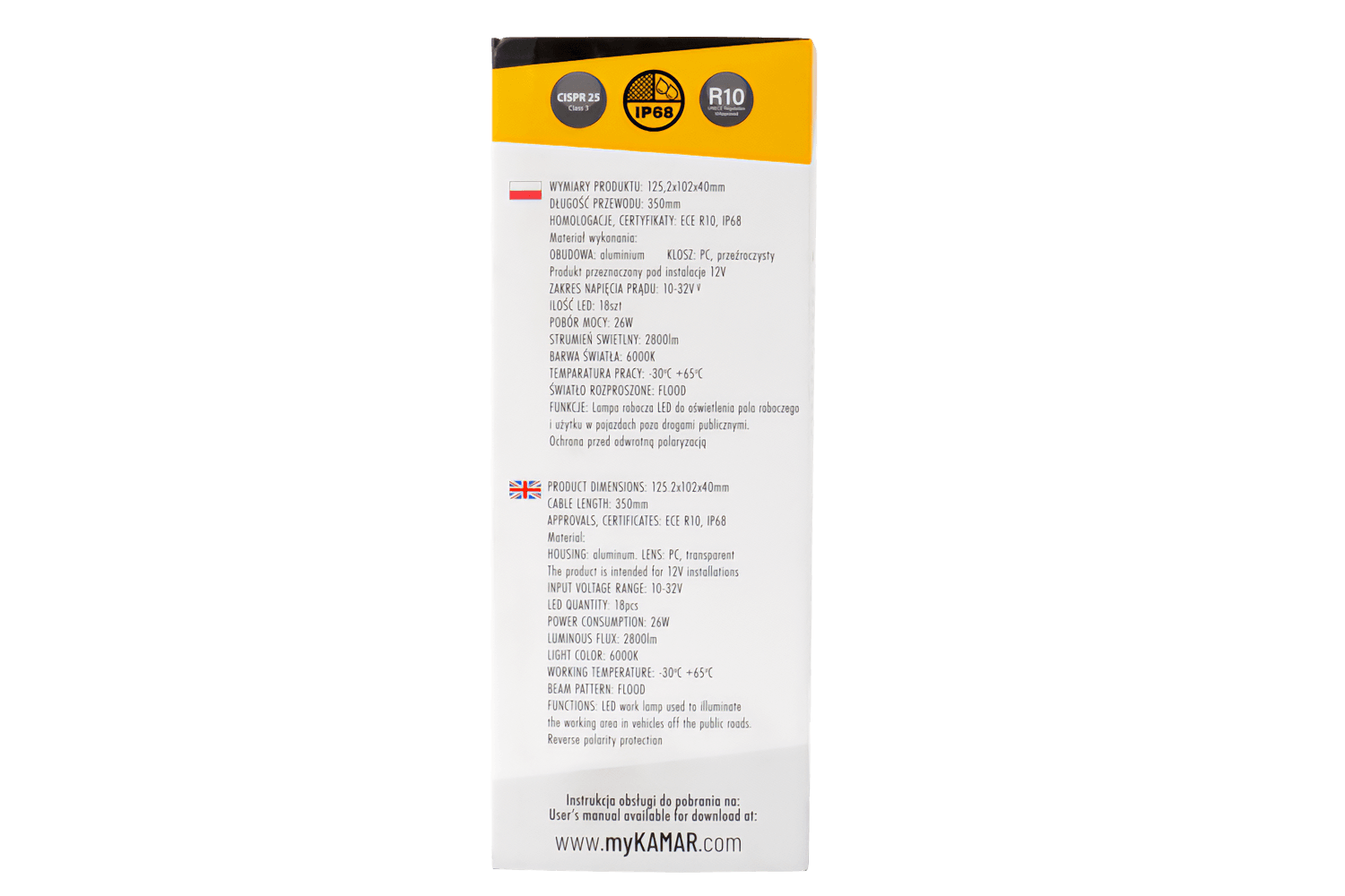 De plus, la lampe dispose d'un certificat R10, qui confirme sa conformité aux exigences de l'Union européenne dans le domaine de la sécurité d'utilisation et de la compatibilité électromagnétique. Le certificat R10 confirme que l'appareil ne provoque pas d'interférences électroniques et peut être utilisé en toute sécurité dans les véhicules équipés d'installations électriques.