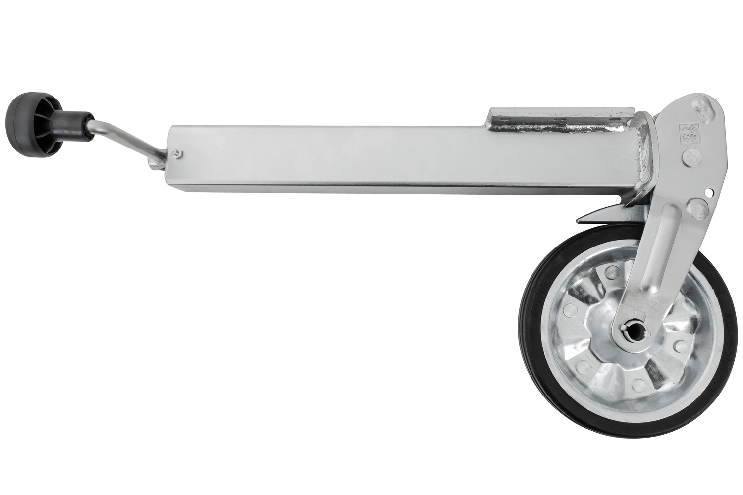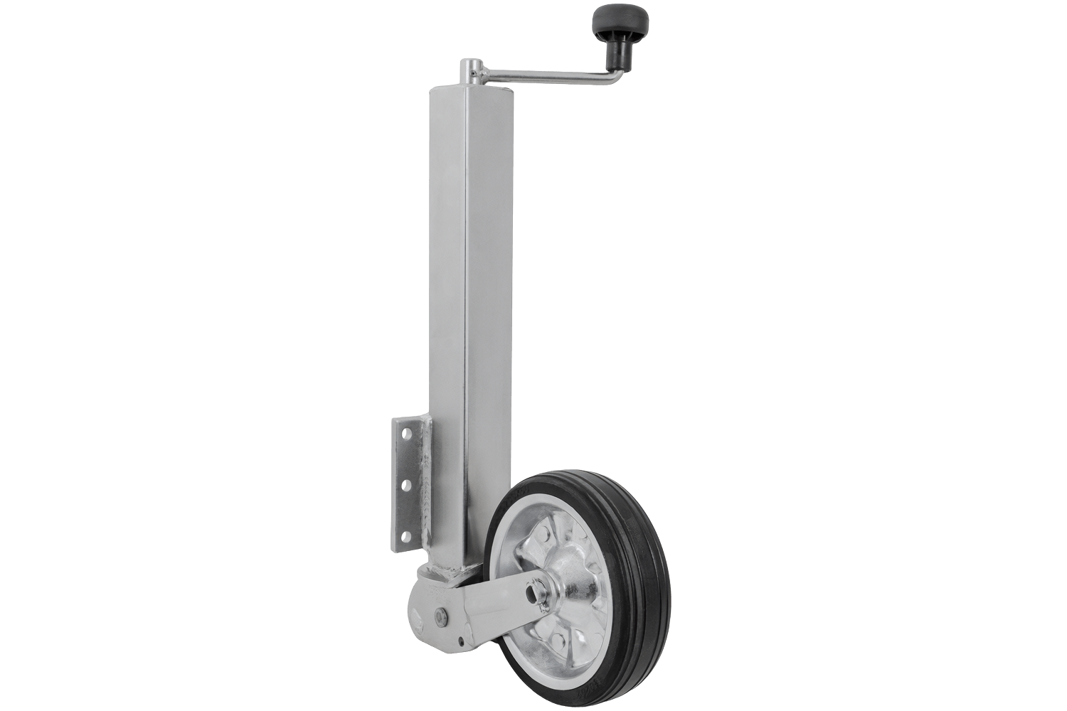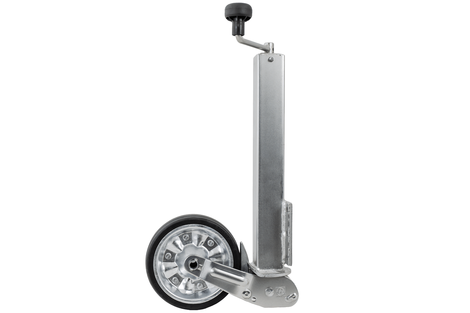 La roue est électrozinguée, ce qui la protège efficacement de la corrosion et des intempéries. Le mécanisme de levage est entièrement automatique, simplifiant considérablement l'utilisation quotidienne. Grâce à sa construction robuste en caoutchouc plein, sa jante en acier et ses roulements lisses, la roue jockey assure des manœuvres confortables, même sur terrain accidenté, tandis que la plaque de montage assure une fixation stable sur le timon de la remorque.
