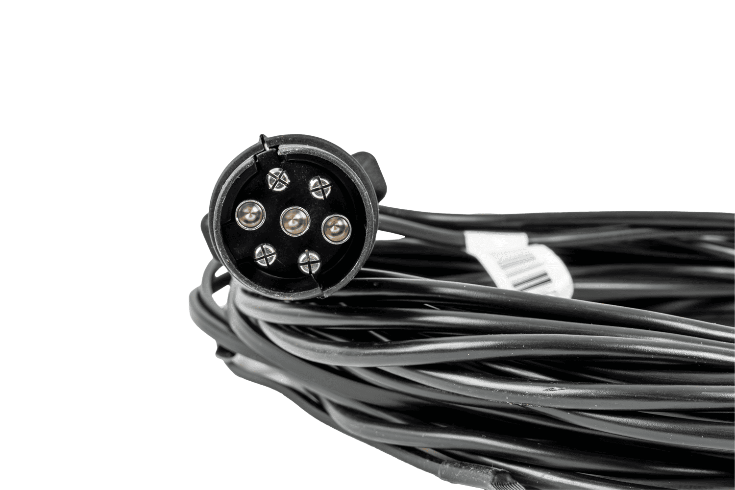 Le faisceau est équipé de deux connecteurs à baïonnette 5 broches pour le raccordement des feux arrière. Le système à baïonnette assure une installation rapide et sécurisée, éliminant ainsi le risque de déconnexion accidentelle pendant la conduite. La conception des connecteurs garantit une connexion étanche et protège les contacts contre la corrosion, ce qui se traduit par un fonctionnement à long terme et sans panne de l'ensemble de l'installation d'éclairage de la remorque.