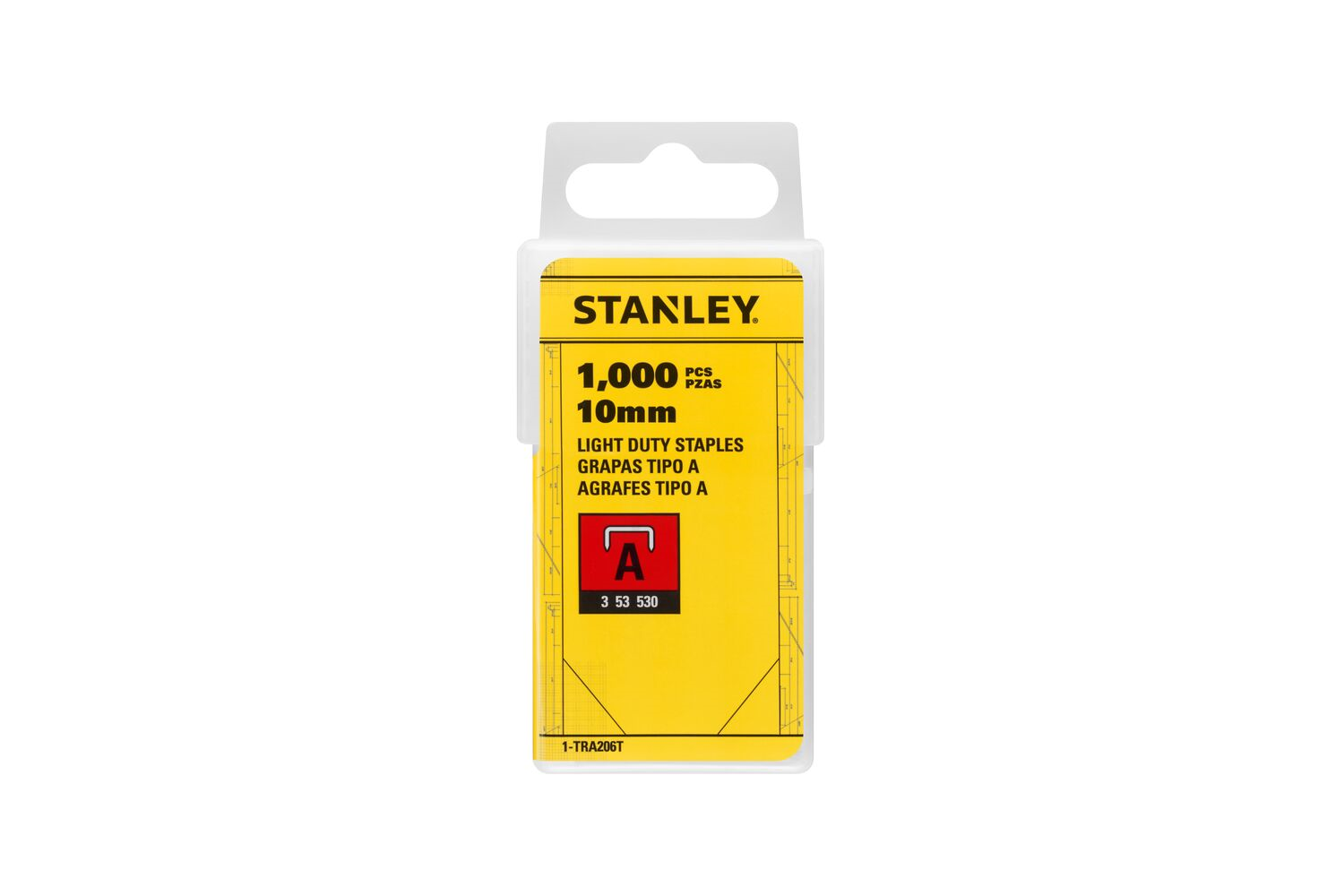 - Les agrafes en acier Stanley 1-TRA206T (type A, 3/53/530, 10 mm) sont un accessoire durable pour la fixation de tissus, de feuilles métalliques et de mailles. Fabriquées en acier galvanisé, elles résistent à la corrosion. Ce coffret de 1 000 agrafes est l