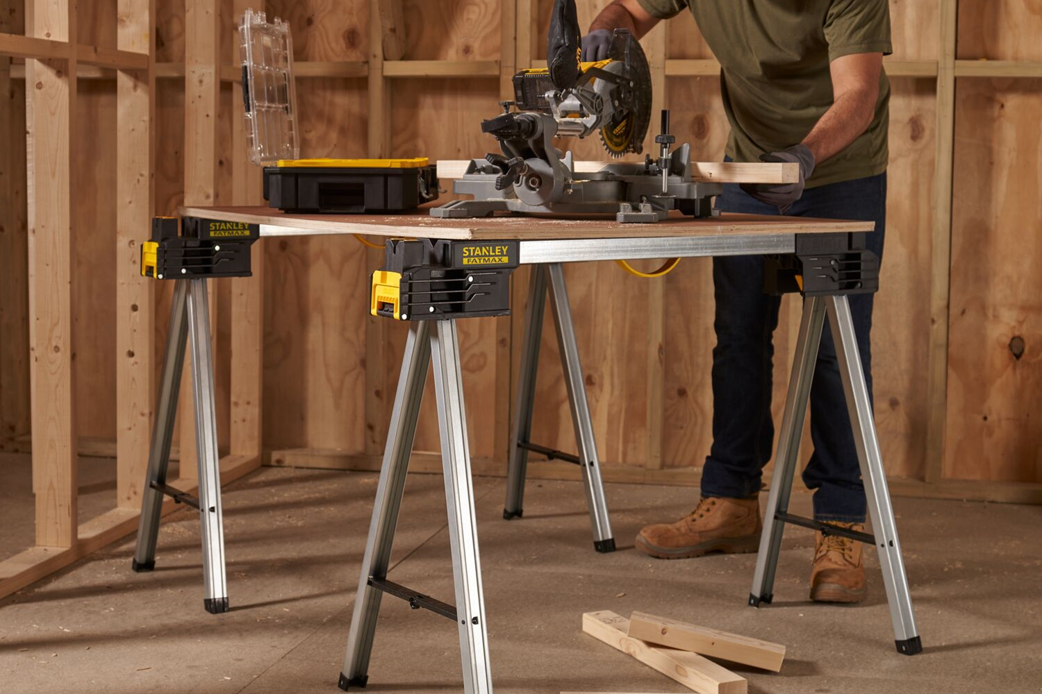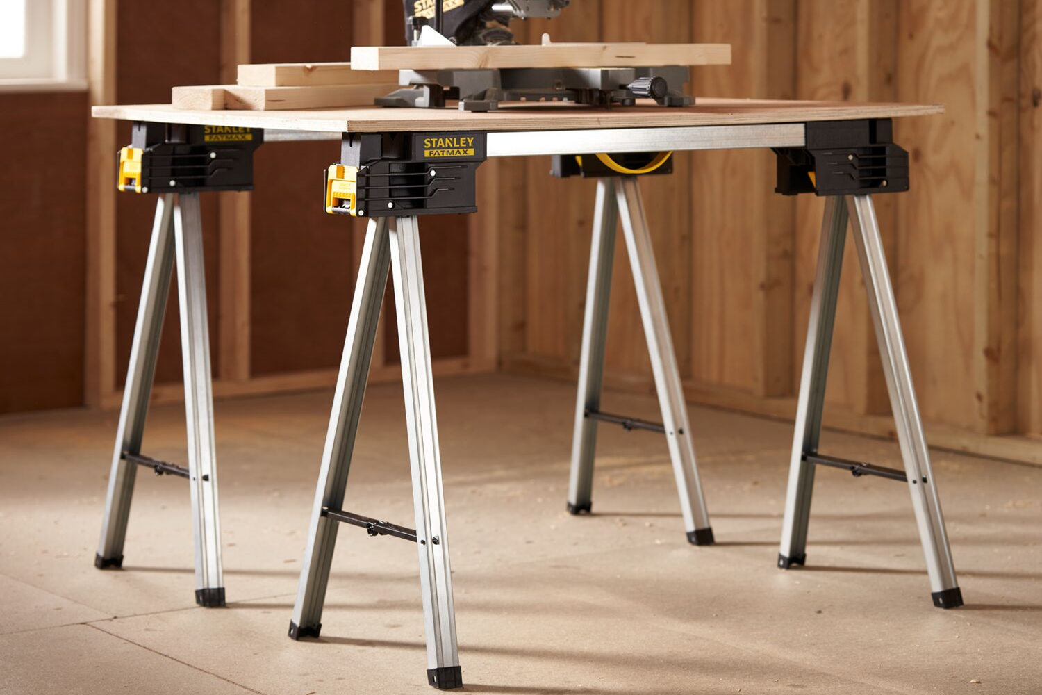 Les supports de travail Stanley FATMAX, fonctionnels et durables, sont un support irremplaçable pour tous les travaux de menuiserie et de construction. Grâce à leur construction solide et à leurs fonctions pratiques, ils assurent stabilité, mobilité et polyvalence d'utilisation aussi bien sur le chantier qu'en atelier. La construction des tréteaux permet la construction rapide et stable d'une grande surface de travail, par exemple une table de travail, grâce à l'utilisation de canaux de poutre. De plus, la partie supérieure des supports est dotée d'une rainure en V (V-Groove), qui permet une coupe précise des tubes et des éléments à profil rond.