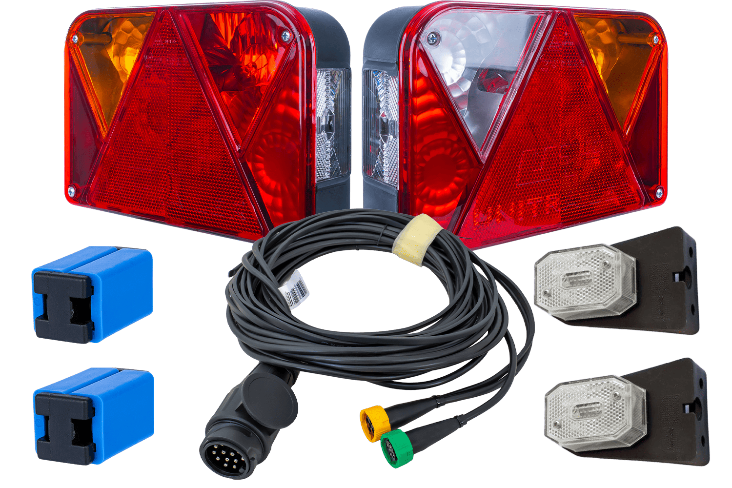 - Kit d'éclairage pour remorques et plateaux améliorant la visibilité et la sécurité routière. Il comprend des feux arrière DOBPLAST DPT35, des feux de gabarit ASPÖCK FLEXIPOINT I et un faisceau de câbles MANTES de 5,2 m avec prise 13 broches.