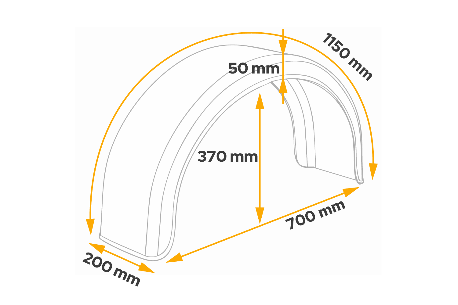 Le garde-boue simple DOMAR D20200, conçu pour les roues de 13 à 14 pouces de diamètre, est un équipement fiable pour les remorques de voiture, entre autres. Ses dimensions sont de 700 mm de long, 200 mm de large et 370 mm de haut. L'absence d'orifices de fixation d'origine permet à l'utilisateur d'ajuster librement les points de fixation à la structure spécifique du véhicule.