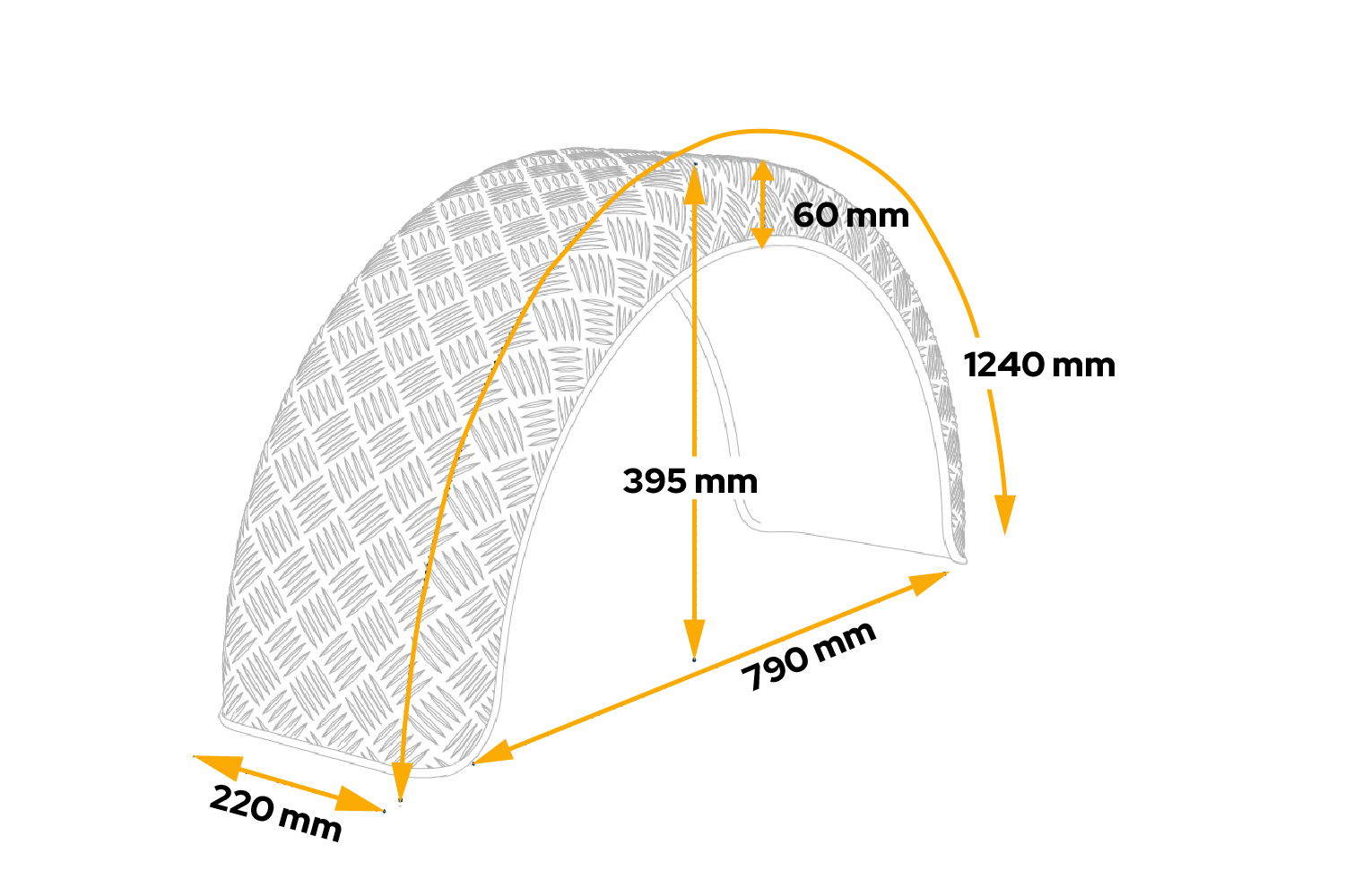 - Garde-boue simple en aluminium D29130 DOMAR, pour les roues de 15 et 16 pouces, longueur de 790 mm et d'une largeur de 220 mm, protège la remorque et son chargement des dommages mécaniques et les autres usagers de la route des projections de cailloux.