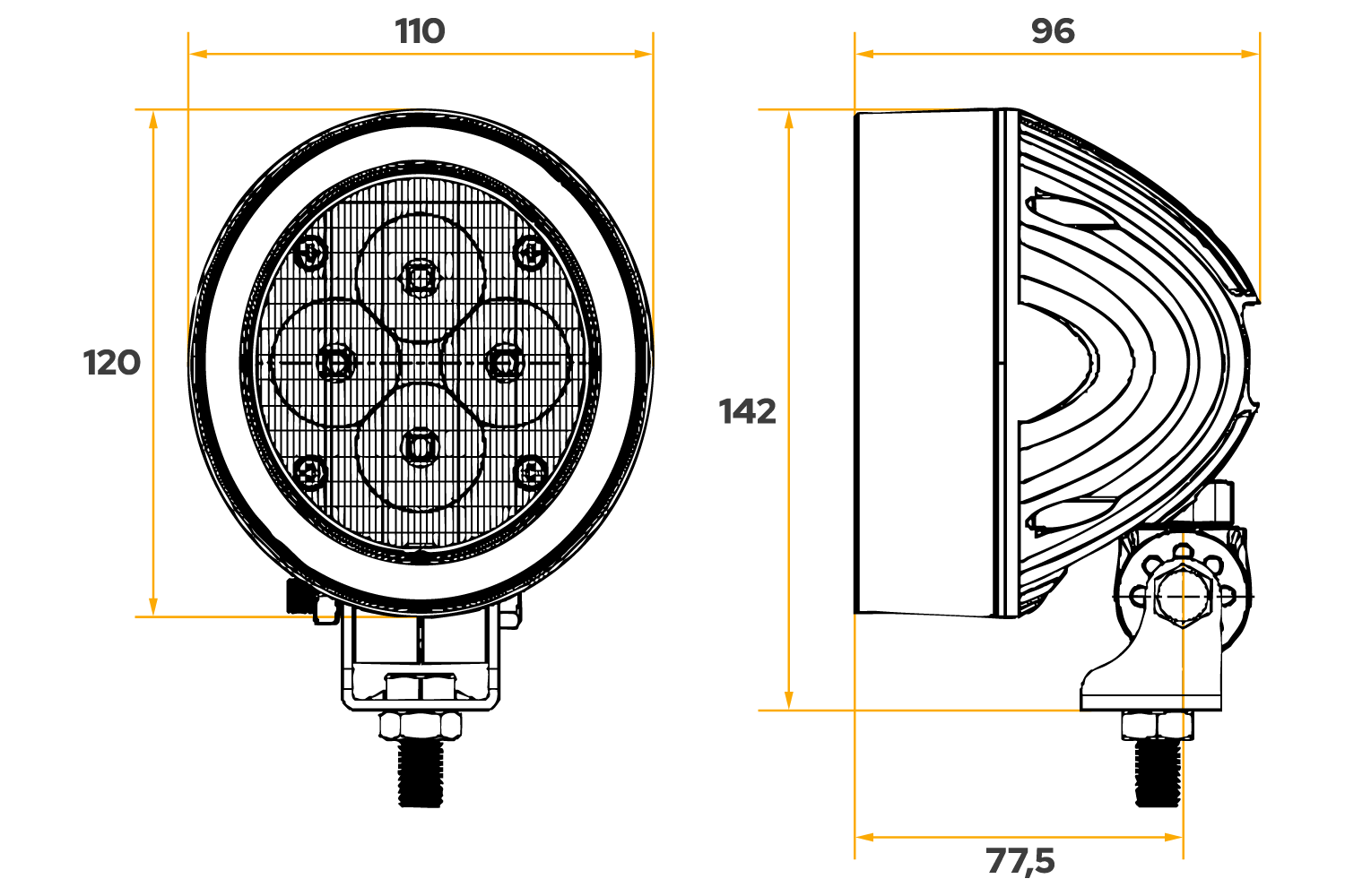 La lampe se caractérise par une haute résistance aux chocs, aux vibrations et aux températures extrêmes allant de -40°C à +80°C, ce qui garantit son fonctionnement fiable dans des conditions de travail difficiles. L'angle de faisceau réglable permet un réglage précis du faisceau lumineux, minimisant ainsi le risque d'éblouissement des autres usagers de la route et augmentant ainsi le confort et la sécurité au travail. De plus, la lampe répond aux exigences de la norme CISPR 25 Classe 4, ce qui signifie une efficacité élevée dans la réduction du bruit électromagnétique, de sorte qu'elle n'interfère pas avec le fonctionnement des autres appareils électroniques du véhicule et peut être utilisée en toute sécurité dans les machines modernes équipées d'électronique sensible.