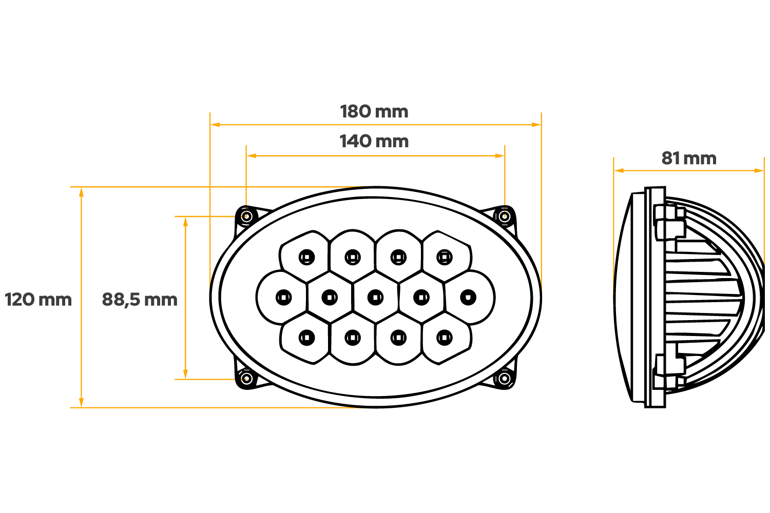 La lampe est équipée de 13 diodes OSRAM d'une puissance de 65 W et d'une luminosité de 5200 lumens. Émet une lumière blanche neutre avec une température de 5700 K, assurant une excellente visibilité la nuit et lors de travaux dans des conditions de visibilité limitée. La lentille diffuse éclaire uniformément l'espace de travail et le rend idéal pour les tâches de précision et l'éclairage de grandes surfaces.
