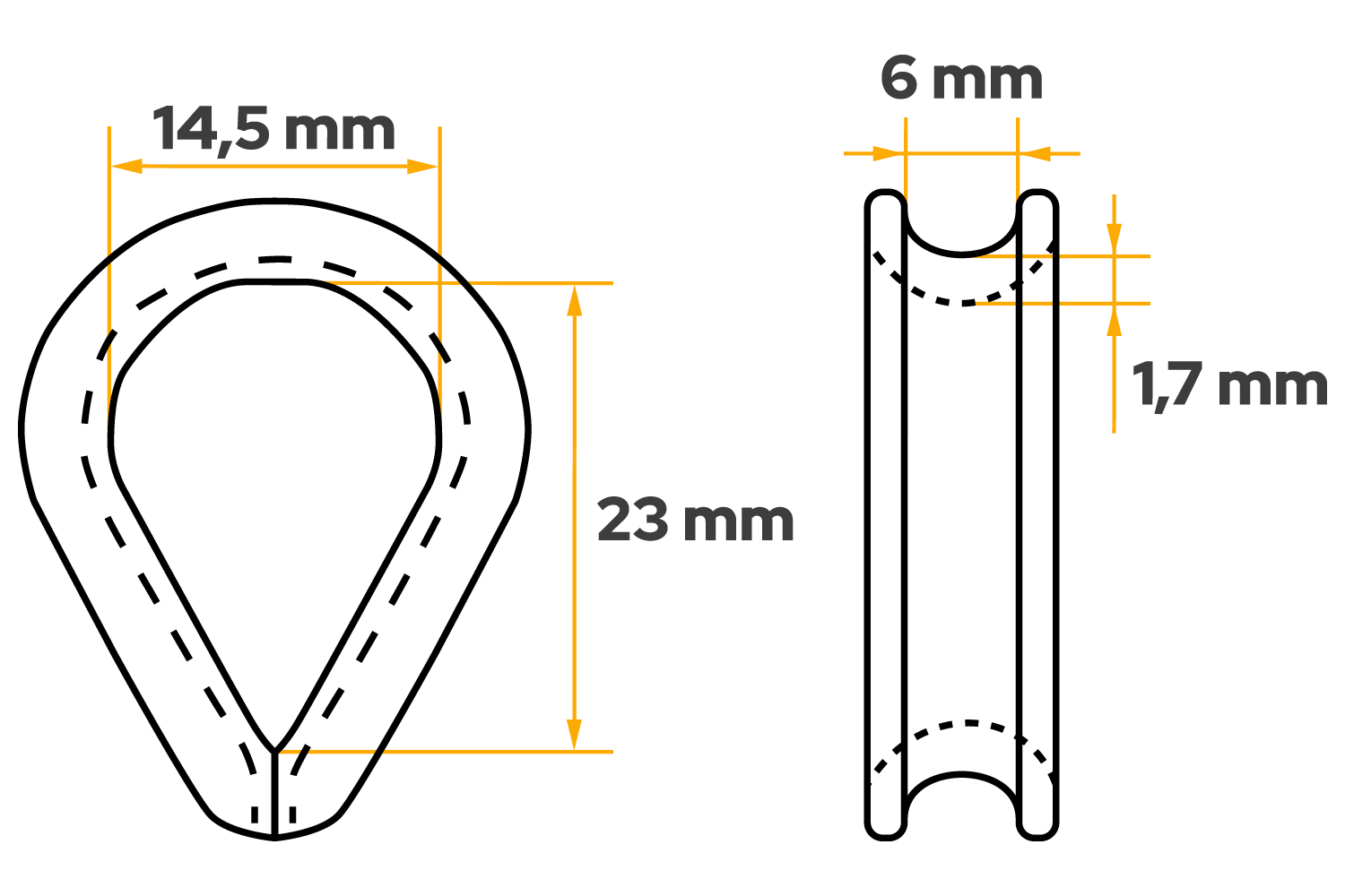 - Cosse-coeur KU.5 de DROMET conçue pour les cordages de 5 mm de diamètre. Largement utilisée pour les cordages de remorquage, de levage, de navigation ou de transport, elle assure une protection contre l'abrasion et la déformation du cordage.