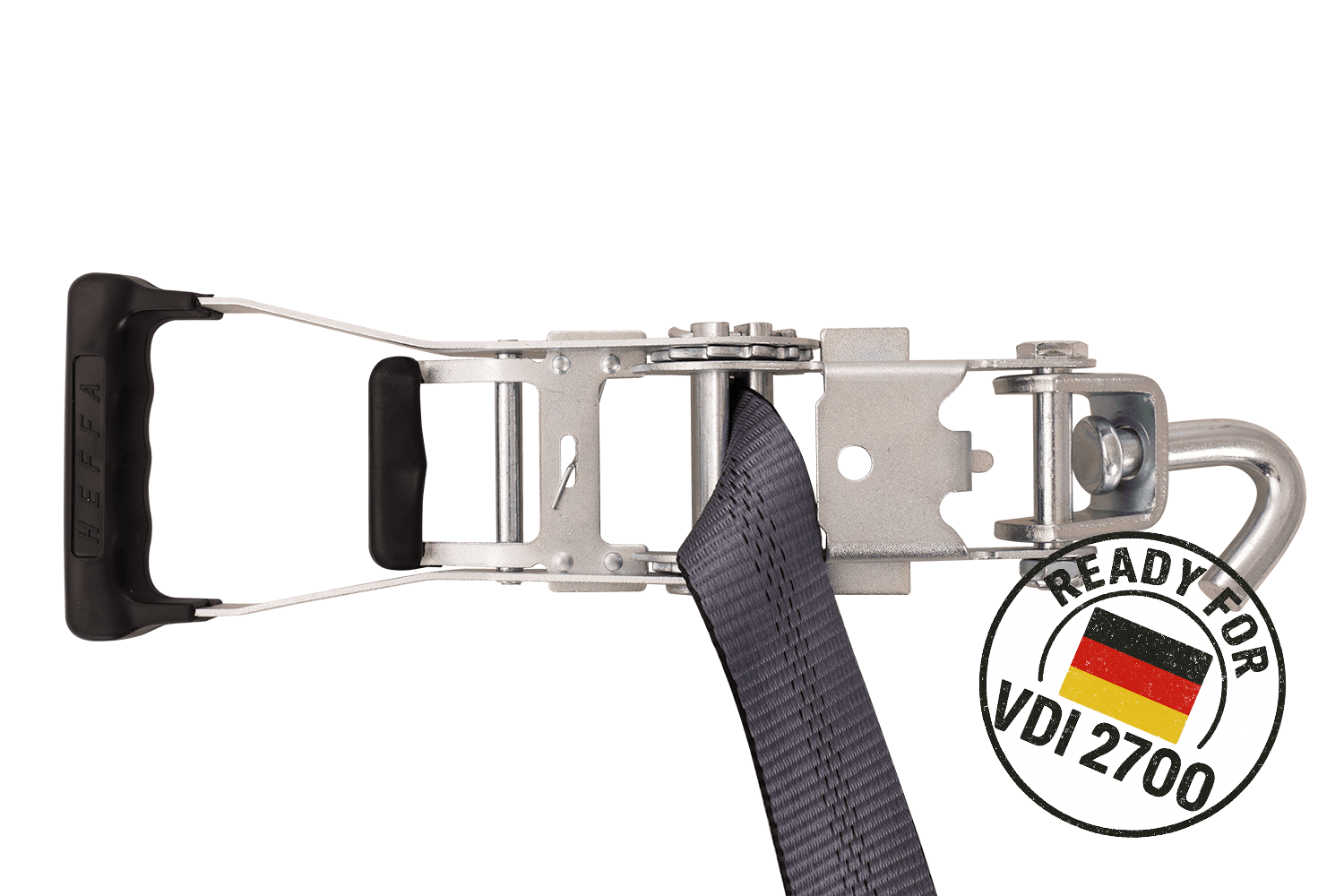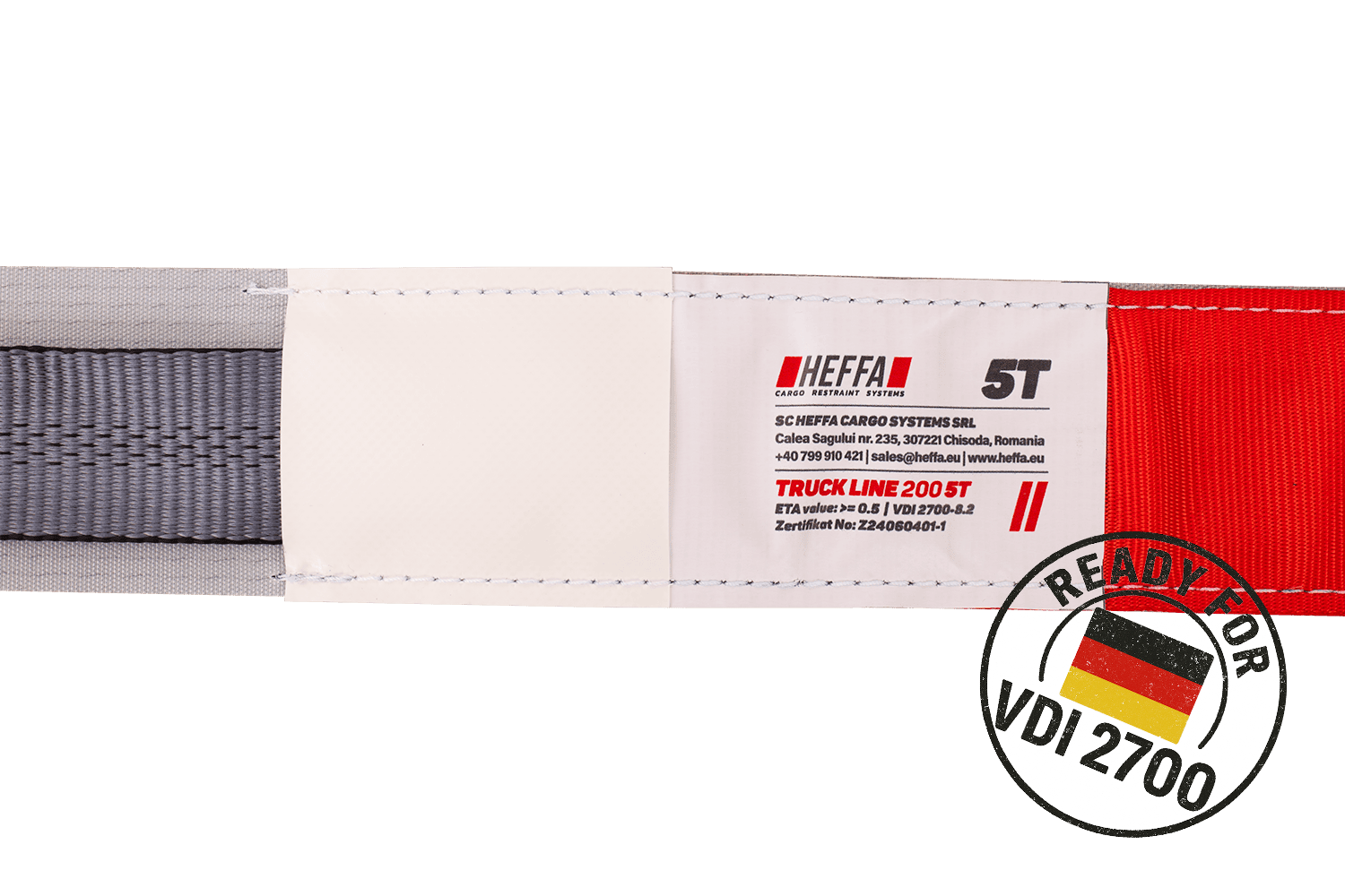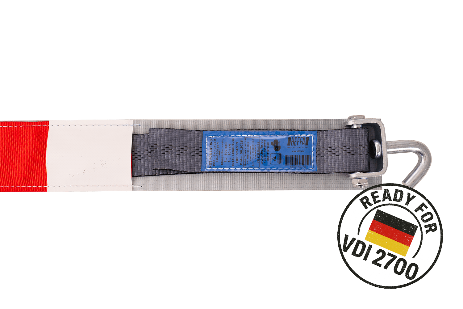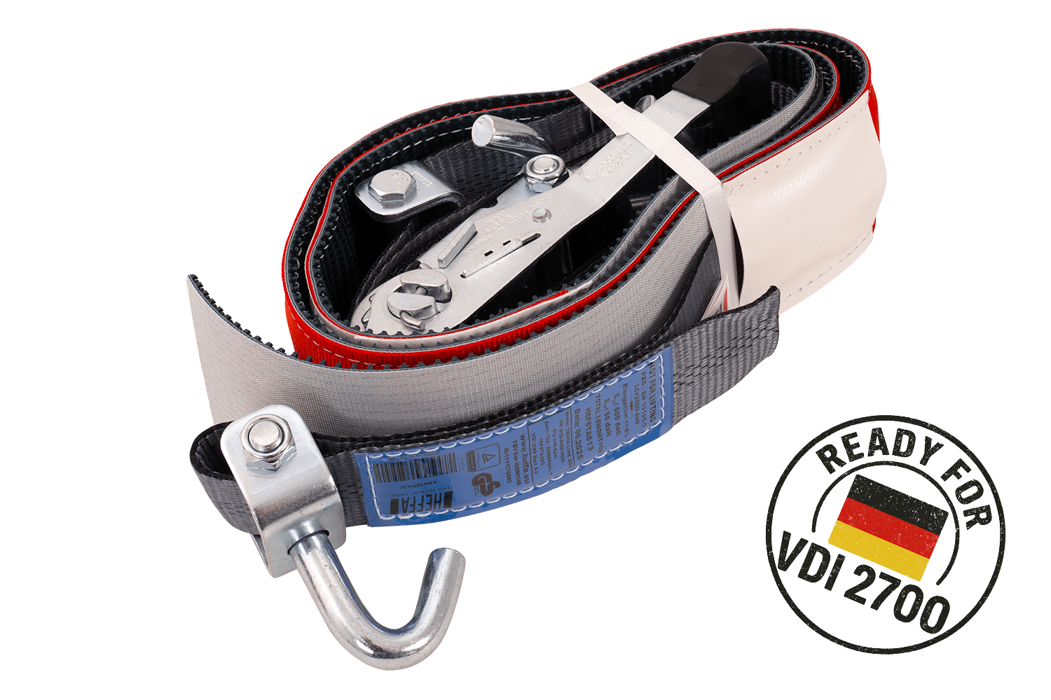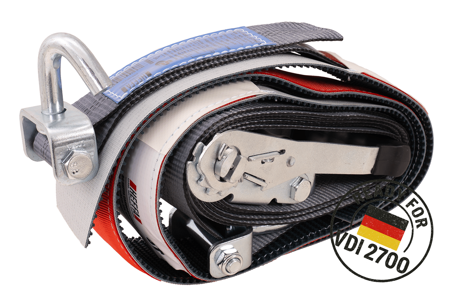 Il s'agit d'une norme européenne spécifiant les exigences relatives aux sangles d'arrimage à tendeur manuel utilisées pour l'arrimage des charges lors du transport routier. La norme EN 12195-2 définit, entre autres, les valeurs des forces de tension (SHF), de la force d'arrimage (LC), de la résistance des sangles, les essais dynamiques et la méthode de marquage du produit. Les sangles certifiées conformes à cette norme répondent à toutes les exigences de sécurité européennes et peuvent être utilisées légalement dans toute l'UE.