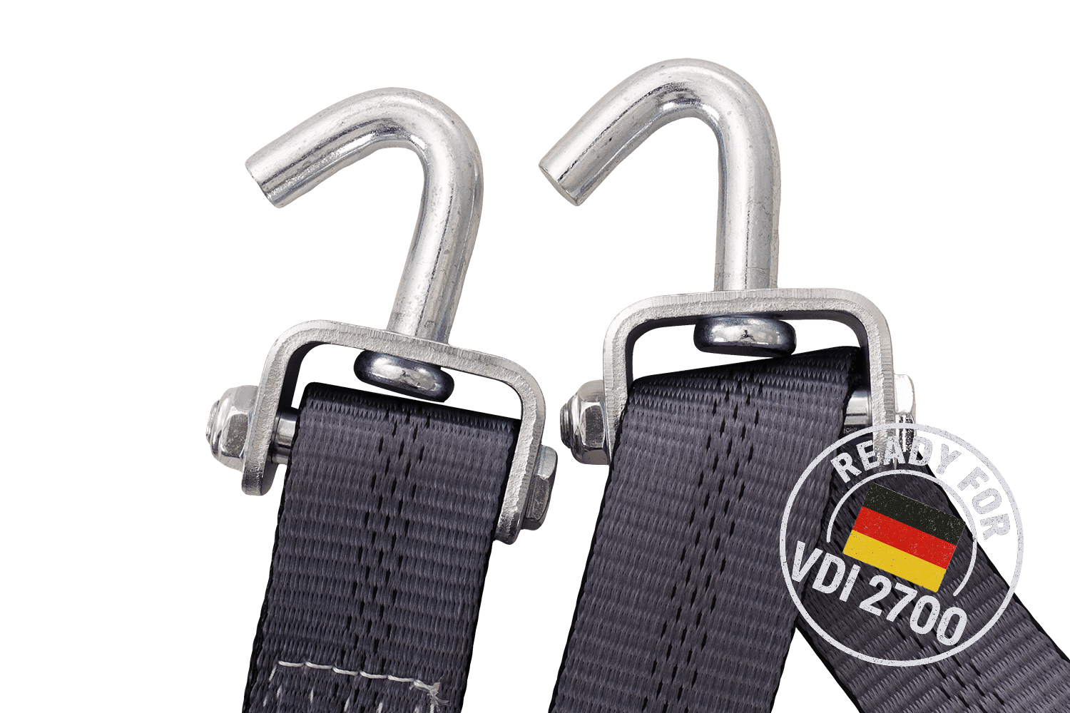 La directive VDI 2700 partie 8.1 est une norme technique allemande qui spécifie les exigences détaillées pour l'arrimage des véhicules transportés sur des remorques à plateau et des remorques. Concernant les sangles d'arrimage, notamment pour le cerclage des roues, cette directive précise, entre autres, le mode de disposition des sangles, le nombre de points d'arrimage requis (par exemple, système à 3 points), les paramètres de force de tension minimale et les principes de leur marquage et de leurs homologations techniques. La conformité à la norme VDI 2700 8.1 garantit que les sangles répondent à des exigences strictes en matière de sécurité, de fiabilité et d'efficacité d'immobilisation du véhicule transporté, un critère crucial pour le transport professionnel de voitures particulières et de camionnettes. L'utilisateur est ainsi assuré que le système d'arrimage utilisé est conforme aux normes européennes et allemandes en vigueur en matière de sécurité routière.