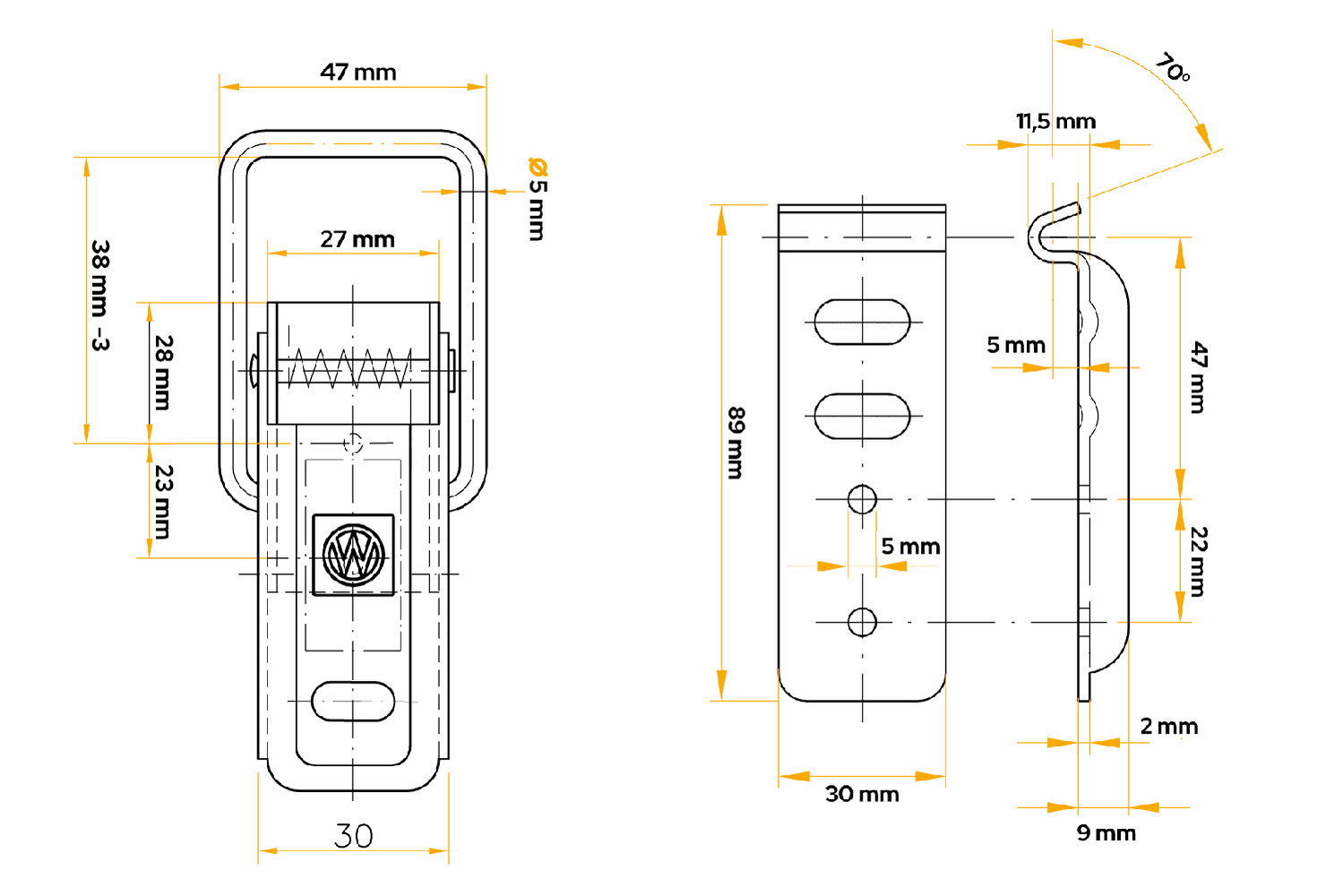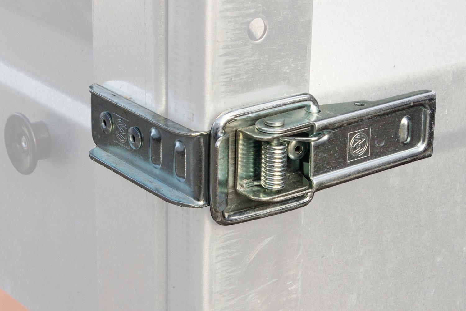 L'attelage BV 60-1 est doté d'un verrou à ressort intégré qui empêche l'ouverture accidentelle du hayon pendant la conduite, augmentant ainsi la sécurité du transport. Le support BVG 60-A, long de 89 mm, s'intègre parfaitement à l'attelage, assurant une fermeture complète et stable du hayon ou des panneaux latéraux.